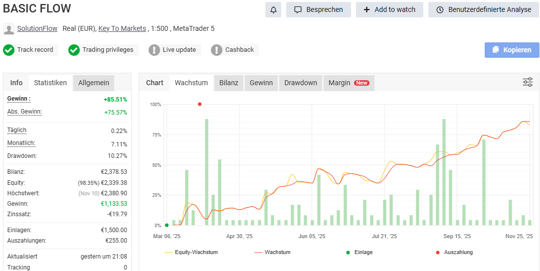 Die Handelsstrategie BASIC FLOW erzielte im November 2025 einen Zuwachs von +2,59 %. Trotz eines ruhigeren Marktumfelds konnte die Strategie damit an ihre kontinuierlich positive Entwicklung anknüpfen. Die kumulierte Performance seit dem Start im März liegt nun bei +85,51 %.