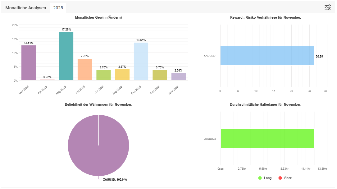 Wie auch in den Vormonaten wurde ausschließlich XAU/USD (Gold) gehandelt – eine gezielte Spezialisierung, die sich auch in diesem Monat erneut bewährt hat.