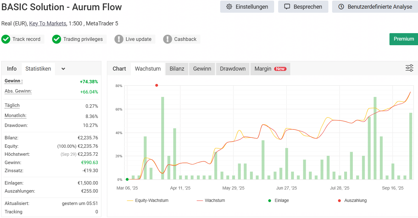 Die vorliegende Grafik veranschaulicht die Performance unserer Handelsstrategie „BASIC Solution – Aurum Flow“ im September 2025. In diesem Monat wurde ein Zuwachs von +13,55 % erzielt – das stärkste Monatsergebnis seit Mai. Seit Beginn der Aufzeichnung im März liegt die kumulierte Gesamtperformance bei +74,38 %.