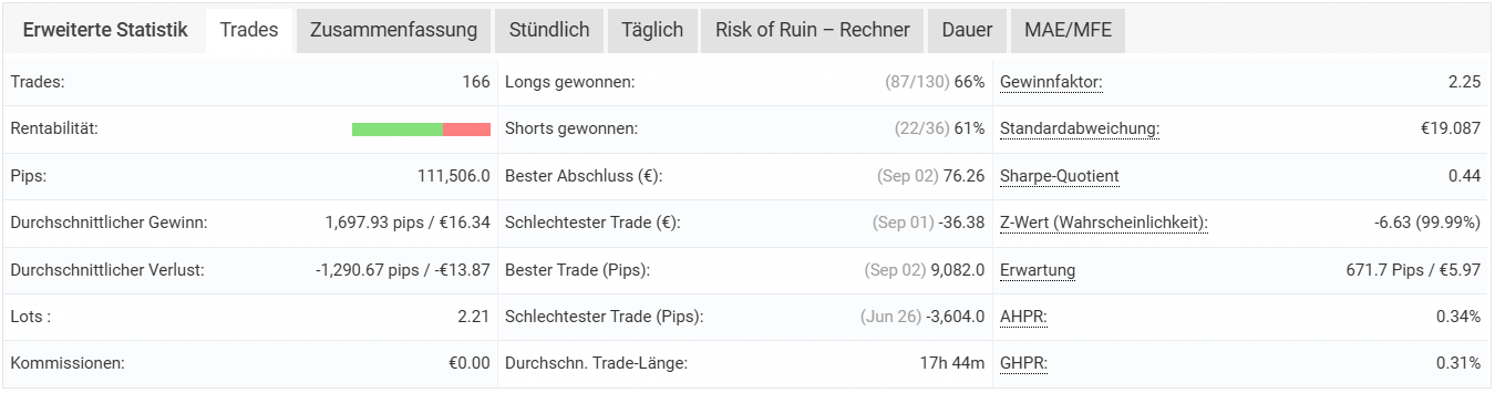 Der beste Trade wurde am 2. September mit einem Gewinn von 76,26 € abgeschlossen, während der schlechteste Trade am 1. September mit einem Verlust von –36,38 € endete. Der Sharpe-Quotient lag mit 0,44 auf dem höchsten Stand seit Beginn der Aufzeichnung. Die Standardabweichung belief sich auf 19,09 €, was auf eine insgesamt moderate Schwankungsbreite der Handelsergebnisse hindeutet.