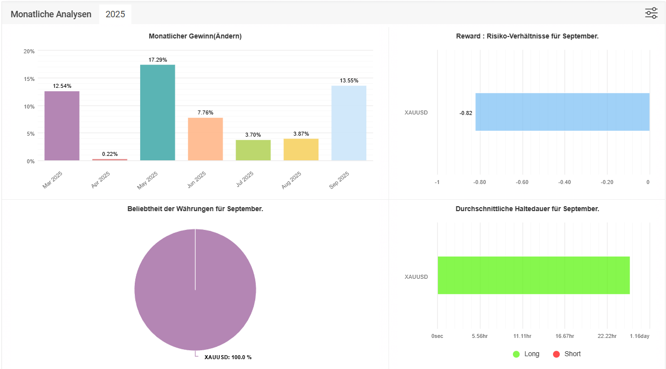 Die Grafik links unten bestätigt die konsequente Fokussierung auf XAU/USD (Gold), das weiterhin zu 100 % gehandelt wurde. Die rechte untere Grafik zeigt, dass die durchschnittliche Haltedauer im September bei rund 17 Stunden und 45 Minuten lag – im Vergleich zu den Vormonaten ein leichter Anstieg, was auf eine ausgedehntere Positionsstrategie hindeuten kann.