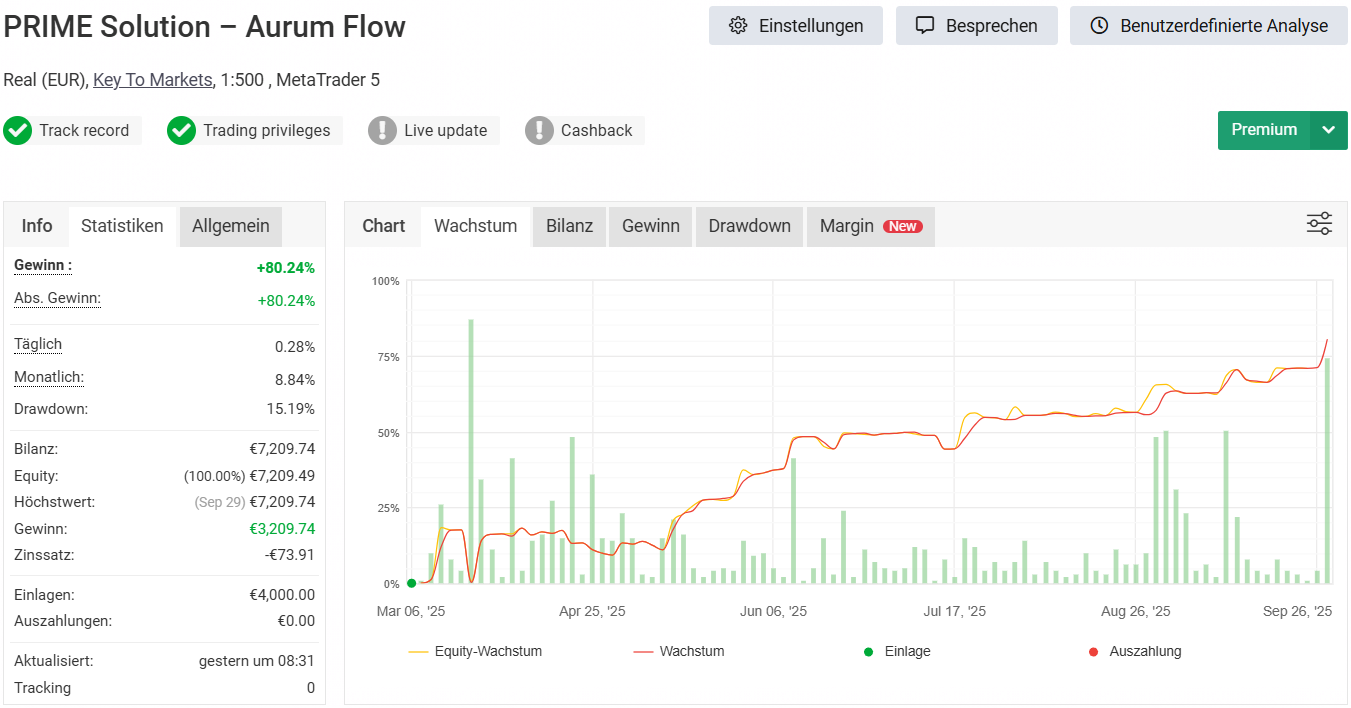 Die vorliegende Grafik veranschaulicht die Performance unserer Handelsstrategie „PRIME Solution – Aurum Flow“ im September 2025. In diesem Monat wurde ein Zuwachs von +14,86 % erzielt – das beste Monatsresultat seit Mai. Das kumulierte Wachstum seit Beginn der Strategie beträgt damit +80,24 %.