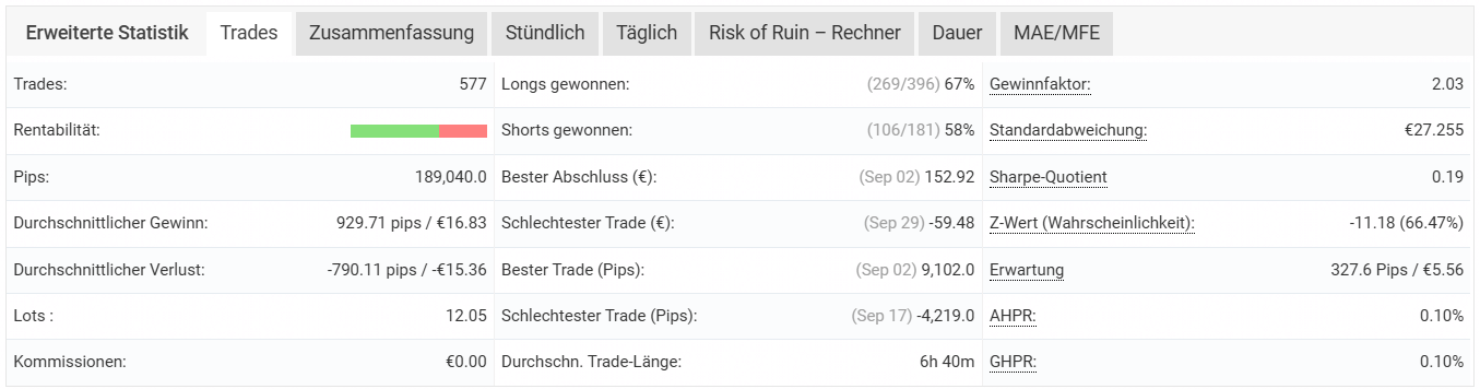 Der durchschnittliche Gewinn pro Trade lag bei 16,83 €, der durchschnittliche Verlust bei 15,36 €. Das bedeutet, dass trotz des negativen Reward-Risiko-Verhältnisses in der Summe mehr verdient als verloren wurde. Der Gewinnfaktor lag bei 2,03 und bestätigt somit eine profitabel arbeitende Strategie. Der beste Trade des Monats wurde am 2. September mit einem Gewinn von 152,92 € abgeschlossen, während der schwächste Trade am 29. September mit –59,48 € zu Buche schlug.