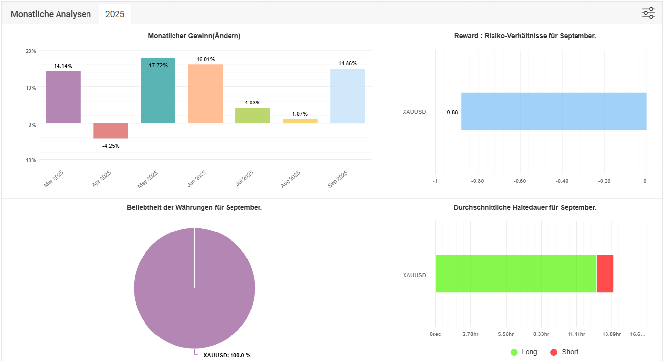 Die Grafik oben links zeigt die Monatsentwicklung von März bis September. Der September reiht sich deutlich über dem Niveau der letzten drei Monate ein und signalisiert eine Erholung nach den ruhigeren Phasen im Juli und August. Die rechte obere Grafik veranschaulicht das Reward-Risiko-Verhältnis im September, das bei –0,88 lag. Dieser Wert zeigt an, dass der durchschnittliche Verlust höher war als der durchschnittliche Gewinn – ein kritischer Punkt, der auf strukturelle Schwächen in der Trade-Auswertung hindeutet, trotz positiver Gesamtperformance.